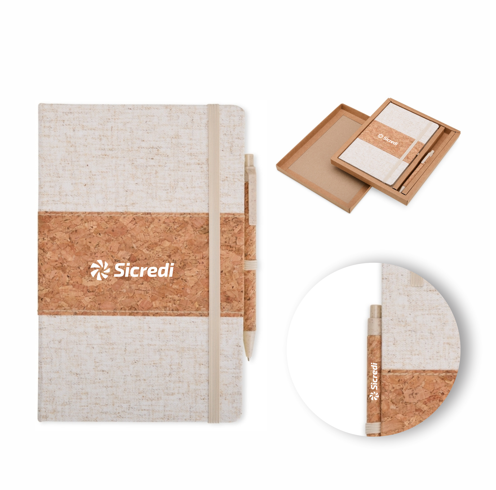 Descrição: Este kit contém uma Caderneta A5 em linho com detalhe em cortiça e suporte para caneta, marcador de página em cetim, aproximadamente 82 folhas com pauta e caneta de cortiça com detalhes em palha de trigo, carga esferográfica azul 1.0mm e acionamento por clique.